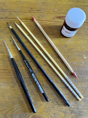 左の2本はドイツのdavinch製、ゴムピックの横の2本は大倉陶園でも使っているという久野の筆。