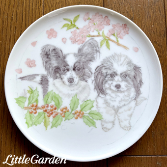 小さなお皿に「ワンコ2頭、桜と柊、英語のメッセージ、周りにレース飾りを入れる」と、盛り沢山のご要望を頂いていて。