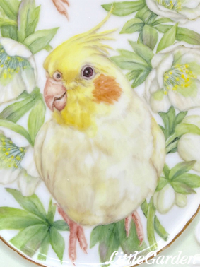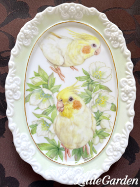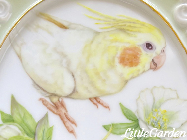 西洋上絵付けとも、チャイナペイントとも言われる技法で、白磁に小鳥と花を手描きしています。